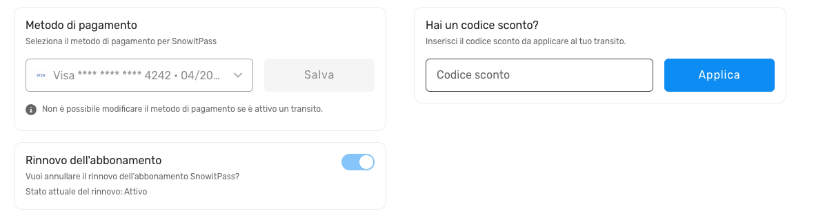 1. Recati in "Abbonamenti SnowitPass" --> "Dettagli dei transiti" e "Gestisci abbonamento".